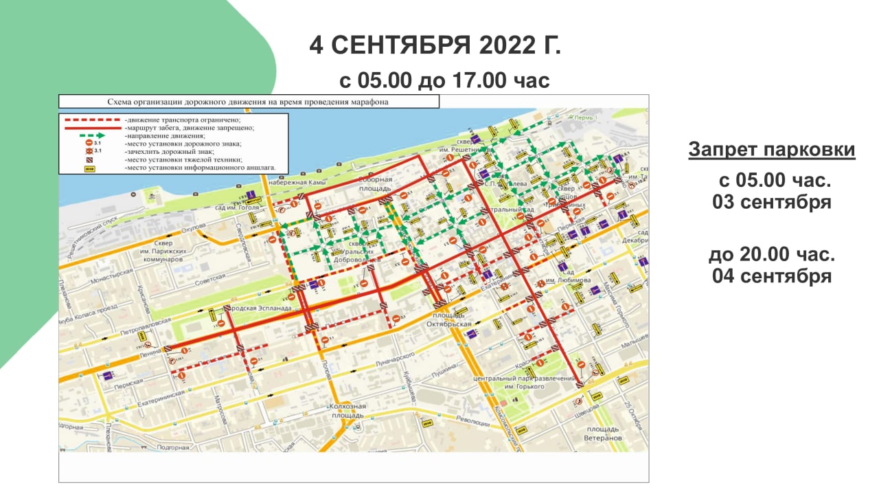 Также для подготовки к марафону и обеспечения безопасности будет запрещена остановка и стоянка всех видов транспортных средств с 11:00 2 сентября до 15:00 3 сентября по ул. Петропавловской от ул. Борчанинова до ул. Крисанова, а также с 22:00 2 сентября до 20:00 4 сентября по ул. Ленина от ул. Борчанинова до ул. Крисанова.