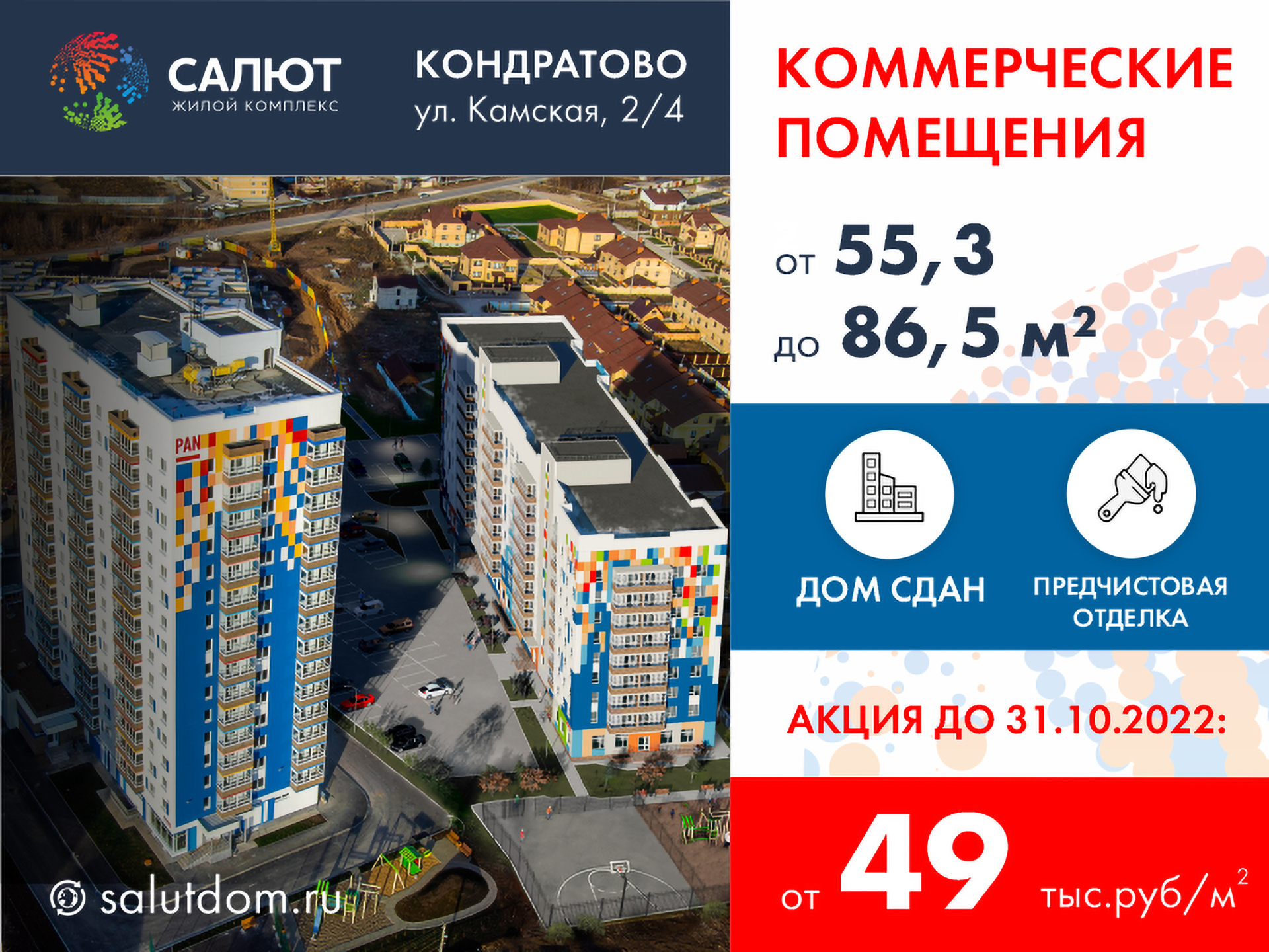 Только до 31 октября 2022 года включительно у вас есть уникальная возможность купить одно из коммерческих помещений во 2 доме ЖК «Салют» со скидкой до 266 тысяч рублей3!