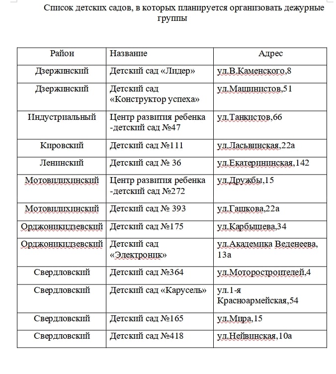 Кроме круглосуточных групп, власти обещают организовать работу дежурных групп, которые будут принимать детей сотрудников оборонных предприятий, чьи родители имеют посменный/ненормированный график работы, в субботу и воскресенье с 07:00 до 19:00. В связи со спецоперацией РФ на территории Украины, оборонные предприятия, в том числе в Перми, перешли на трёхсменный режим или ненормированный график, а также задействовали выходные дни.