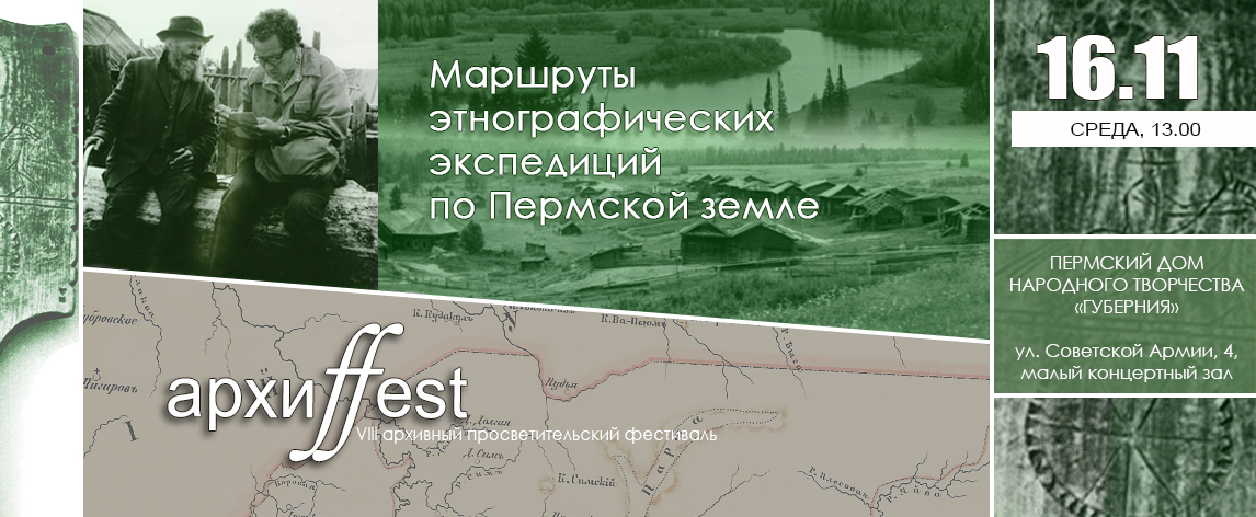16 ноября в 13.00 в Пермском доме народного творчества «Губерния» состоится презентация проекта «Маршрутами этнографических экспедиций по Пермской земле» (16+). Архивный проект, направленный на популяризацию и сохранение истории населённых пунктов Прикамья, стал победителем конкурса «Возрождение исторической памяти Пермского края».