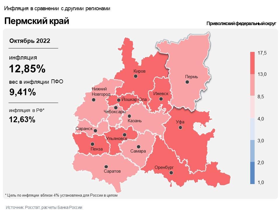Показатель инфляции в октябре в Пермском крае ниже, чем в Приволжском федеральном округе (12,9%), но выше, чем в целом по России (12,6%). Темп прироста цен на продовольственные товары в годовом выражении в октябре снизился до 12,54%. Основные причины — расширение предложения за счёт увеличения отечественного производства и снятия ограничений на ввоз импортных продуктов, а также снижение затрат производителей.