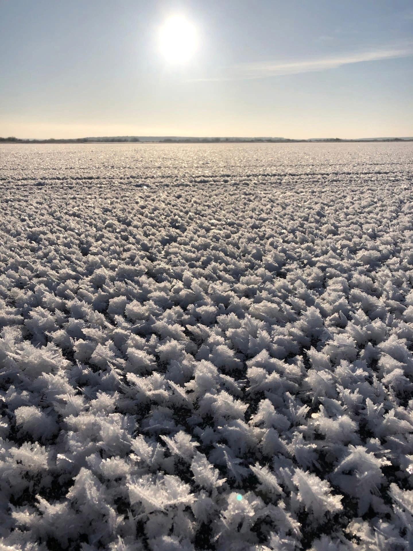 Как поясняют синоптики, «цветы» формируются на поверхности льда в мороз при условиях относительной влажности менее 100% и отсутствия снежного покрова и ветра.