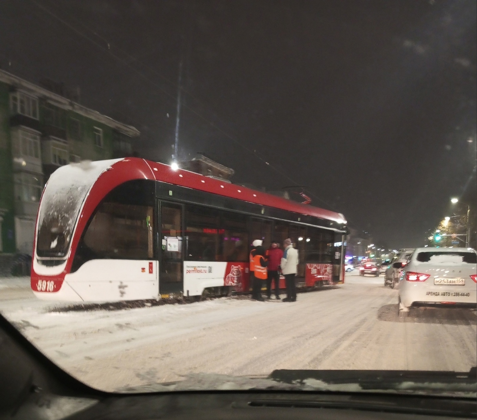 Из-за снегопада в Перми с рельсов сошёл трамвай № 11
