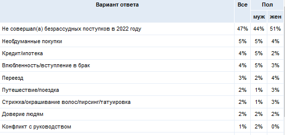Среди тех, кто своим главным безрассудством в 2022 году считает путешествие, радикальное изменение внешности или переезд, оказалось больше женщин. В том, что они взяли необдуманный кредит или легкомысленно женились, чаще признавались мужчины. В целом женщины в 2022 году вели себя благоразумнее мужчин: среди них безрассудных поступков не совершала каждая вторая (51%), тогда как среди представителей сильного пола — только 44%.