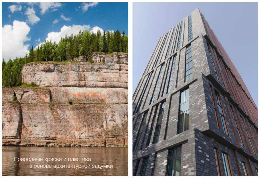В презентации нового ЖК сказано, что в основу архитектурной задумки легло географическое расположение города, находящегося в окружении лесов, рек и скал: «Линии фасадов могут иметь характерные сломы, цветовые раскладки кирпича с вкраплениями. Могучие, самодостаточные объёмы секций объединены стилобатной частью, в которой располагаются коммерческие помещения, стрит-ритейл. Мы используем местные природные краски и пластику, чтобы создать индивидуальный характер проекта».