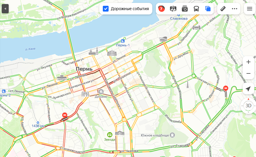 Судя по данным сервиса Яндекс. Пробки, сейчас город сковали 7-балльные пробки. Затруднено движение по Комсомольскому проспекту, шоссе Космонавтов, улицам Ленина, Попова и Пушкина.
