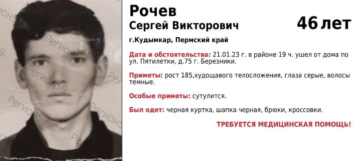 В Пермском крае волонтёры поискового отряда «Регион 59» объявили в розыск 46-летнего Сергея Рочева из Березников. Мужчина вечером 21 января ушёл из дома по ул. Пятилетки, 75 и до сих пор не вернулся. Об этом сообщается на странице волонтёров в соцсетях.