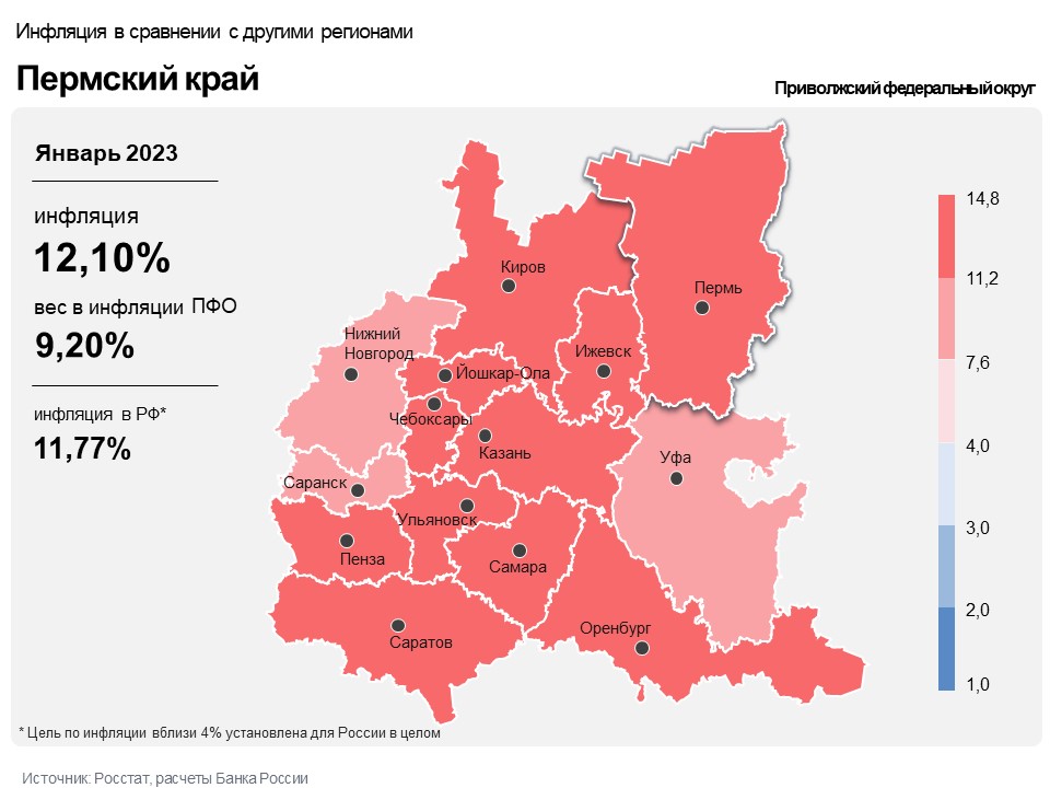 В январе 2023 года годовая инфляция в Пермском крае понизилась на 0,33 п.п. по сравнению с декабрём до 12,10%. Несмотря на снижение, это выше показателя по Приволжскому федеральному округу (11,71%) и по России в целом (11,77%). Об этом сообщили в Пермском отделении Банка России.