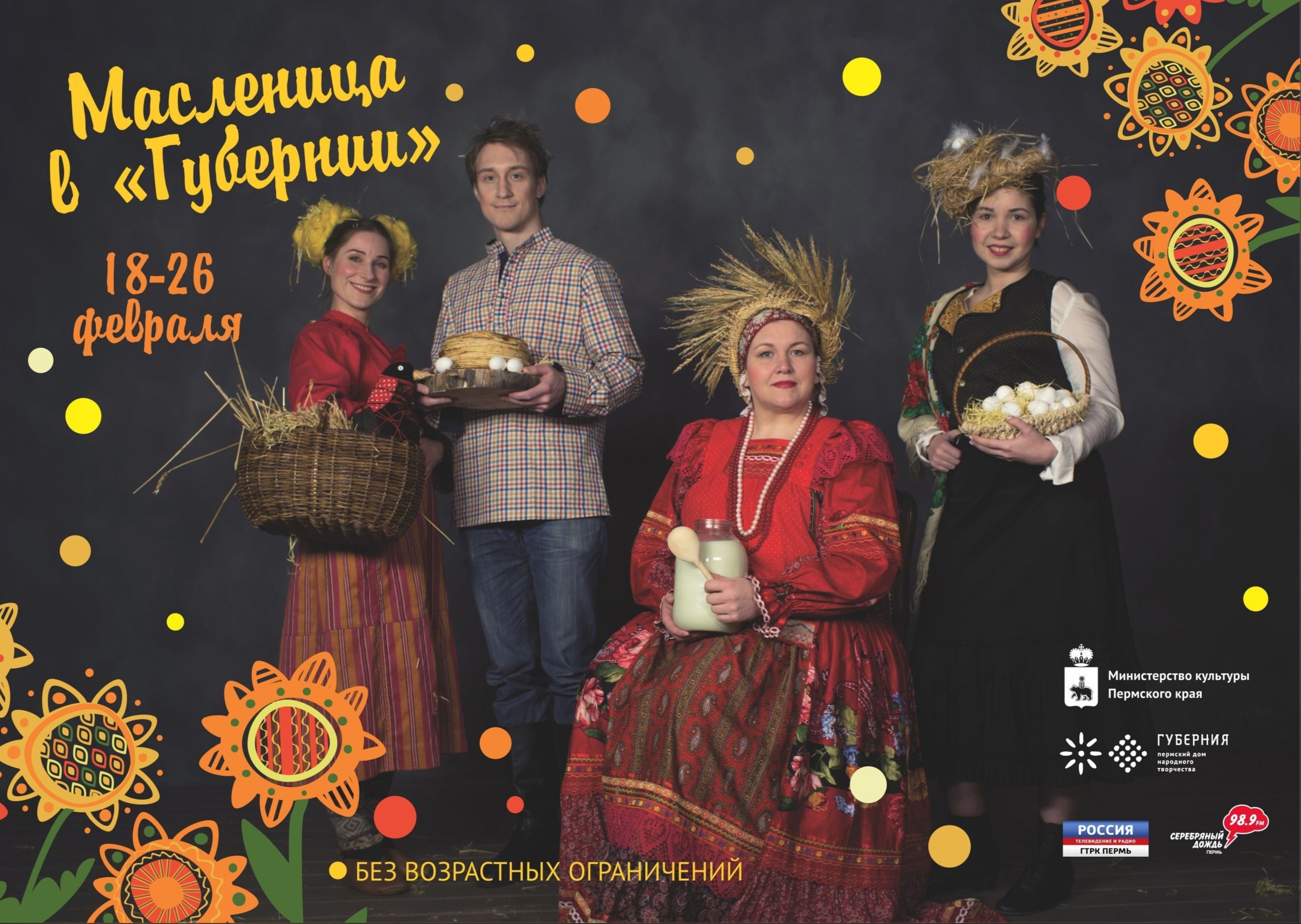 С 20 по 26 февраля в ПДНТ «Губерния» проходит «Масленица в «Губернии» (0+). С 20 по 22 февраля в 11:00 программа «Мал да удал!» (0+) — игры, розыгрыши и викторина о народных традициях. В эти же дни в 16:00 стартует «Неоновая Масленица» (16+) — возможность почувствовать глубину народных традиций, увидеть народное ряженье, поиграть в масленичные молодёжные игры, поучаствовать в переплясе, попеть масленичные песни, а также сделать масленичный боди-арт и, конечно, угоститься блинами. 23 февраля в 17:00 пройдёт «Вечер у камина» (6+) — концерт при участии ансамбля жестовой песни «Поющие руки», ансамбля танцев на колясках «Гротеск» и хора русской песни «Камушка». 24 февраля в 19:00 состоится интеллектуально-блинное шоу для ценителей и знатоков традиций «Вкусно о традициях» (6+). 25 февраля в 11:00 и 14:00 самых маленьких гостей ждёт спектакль «Как Валенька и Варенька Масленицу прокатали» (0+), а с 14:00 до 19:00 пройдут Масленичный бал (6+) и широкое гулянье с народными играми и затеями на площади перед «Губернией». 26 февраля в 09:00 Масленичный поезд направится в село Сива, где пройдёт большой праздник, посвящённый проводам Масленицы. Также в рамках «Масленицы в «Губернии» пройдёт выставка традиционной вышивки Надежды Гармановой «Стёжки-дорожки» (0+) и будет работать лавка изделий мастеров народных художественных промыслов Пермского края «Пермская диковина» (0+).