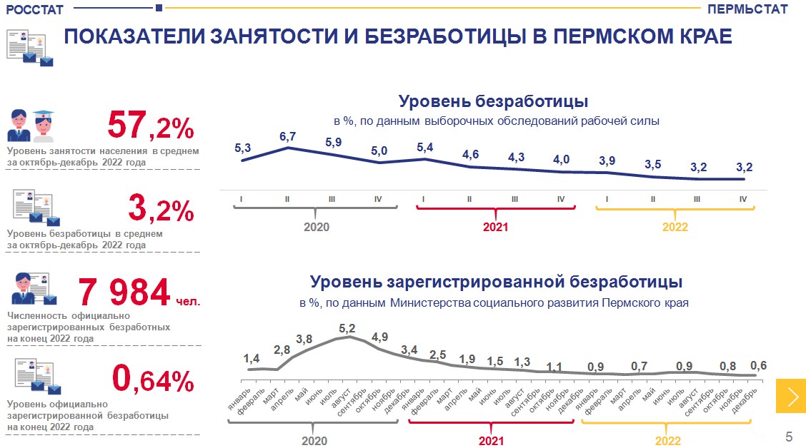 Что касается занятости населения, то в четвёртом квартале 2022 года её уровень составил 57,2% (соотношение занятых к общей численности населения). По этому показателю Пермский край находится на 11 месте в ПФО (вместе с Республикой Марий Эл).