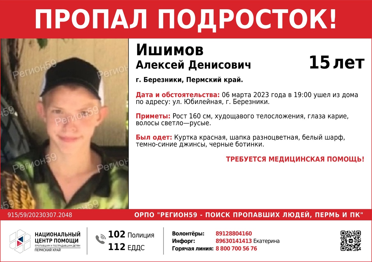 Поисковый отряд «Регион 59» распространил ориентировку на 15-летнего подростка Алексея Ишимова. Сообщается, что 6 марта около 19 час. он вышел из дома по ул. Юбилейной в Березниках Пермского края и с тех пор его местонахождение неизвестно.