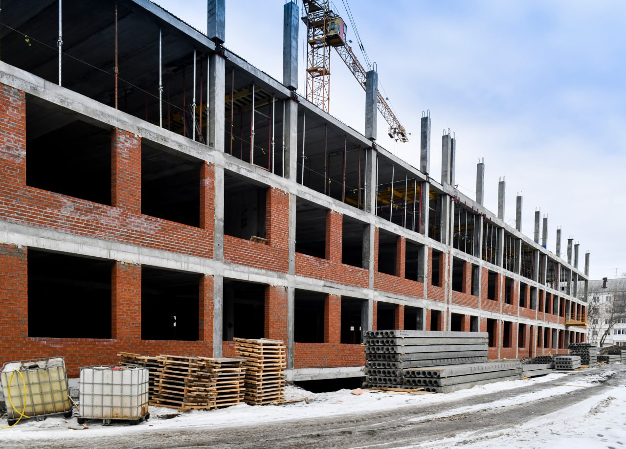 «В ноябре были забиты первые сваи, а сейчас строительство ведется уже на уровне третьего этажа. Выполнен монтаж колонн каркаса первого, второго и третьего ярусов, завершается монтаж плит перекрытия третьего этажа. Параллельно идёт кладка наружных стен», — рассказал мэр.