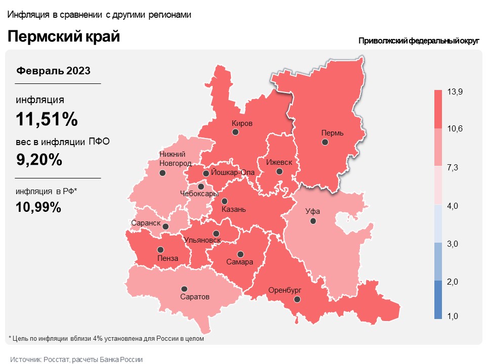 Годовая инфляция в Приволжском федеральном округе в феврале 2023 года составила 10,9% (после 11,71% месяцем ранее). При этом она оказалась ниже, чем в целом в России – 10,99%.
