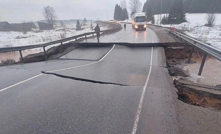 На подъезде к Перми от федеральной трассы М-7 «Волга» талыми водами разрушена дорога