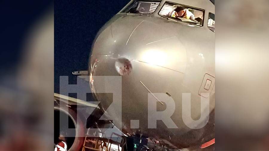 В распоряжении редакции есть фотография, на которой видно, что носовая часть лайнера повреждена — там образовалась вмятина.