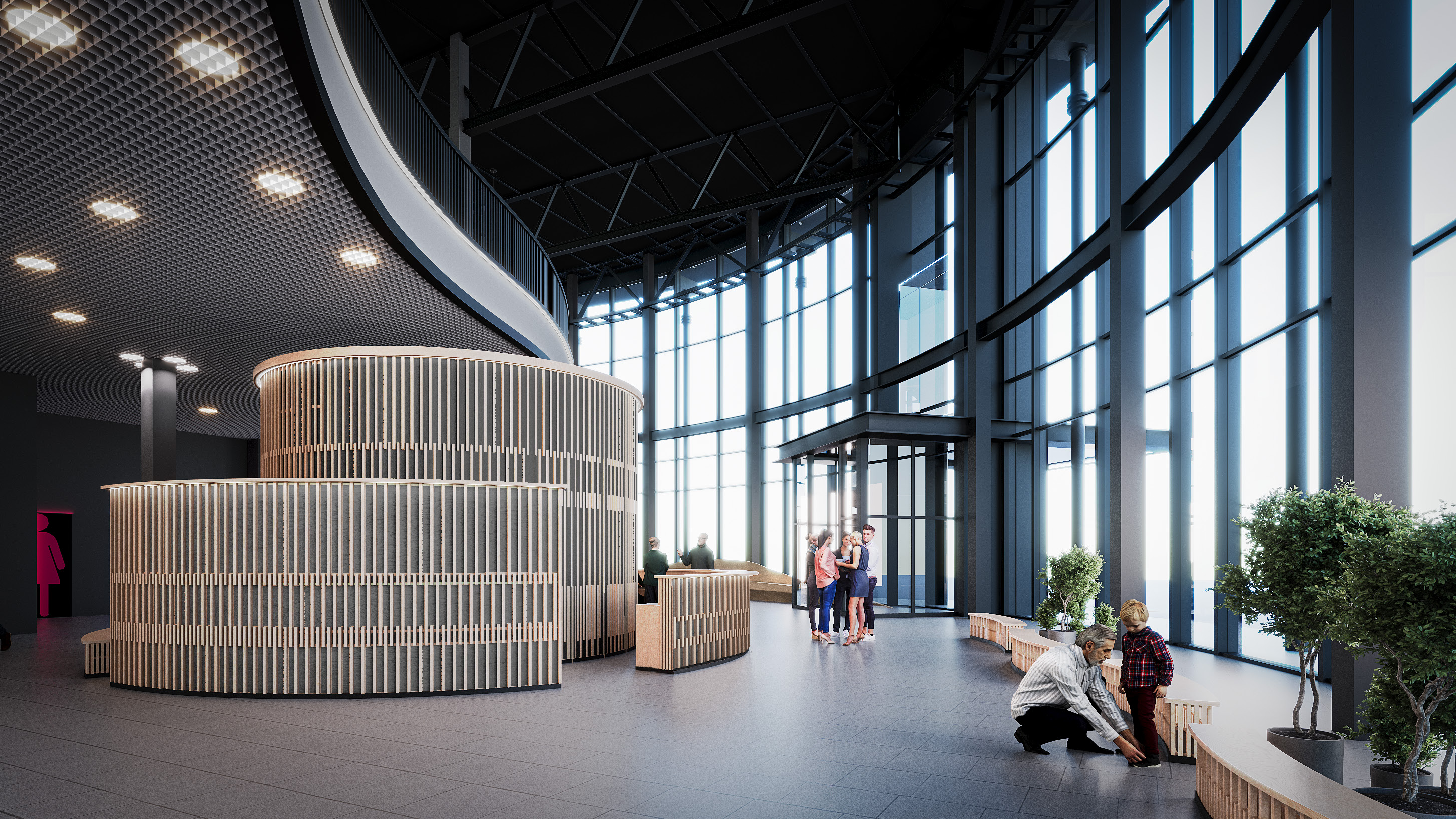 Основной вход в здание будет находиться там же, где и сейчас, с угла улиц Крисанова и Окулова, но рецепция сместится от центра влево, в сторону ул. Попова, и будет совмещена с гардеробом. Здесь же будет информационная стойка и дежурный администратор, а вот кассира не будет: Наиля Аллахвердиева сказала, что сейчас готовится новое штатное расписание, настроенное на то, чтобы зритель сразу встречался с вовлечённым в музейную жизнь человеком, без технических посредников.