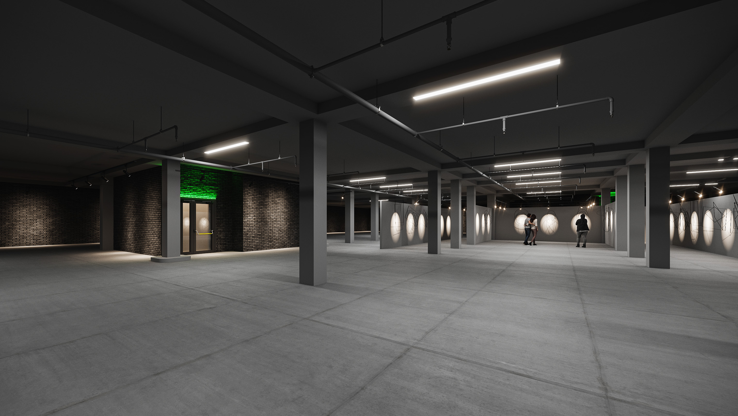 Так называемый «минус первый этаж» — это огромная подземная парковка, которая по площади превышает здание: она продолжается под прилегающей территорией до самой ул. Монастырской. Здесь будет ещё одно выставочное пространство площадью 1550 кв. м и высотой 4 м; ещё 1150 кв. м будут отданы под основное помещение хранилища. У парковки есть отдельный вход, что позволит этому пространству работать при необходимости автономно, а в музее смогут проходить одновременно несколько параллельных событий.