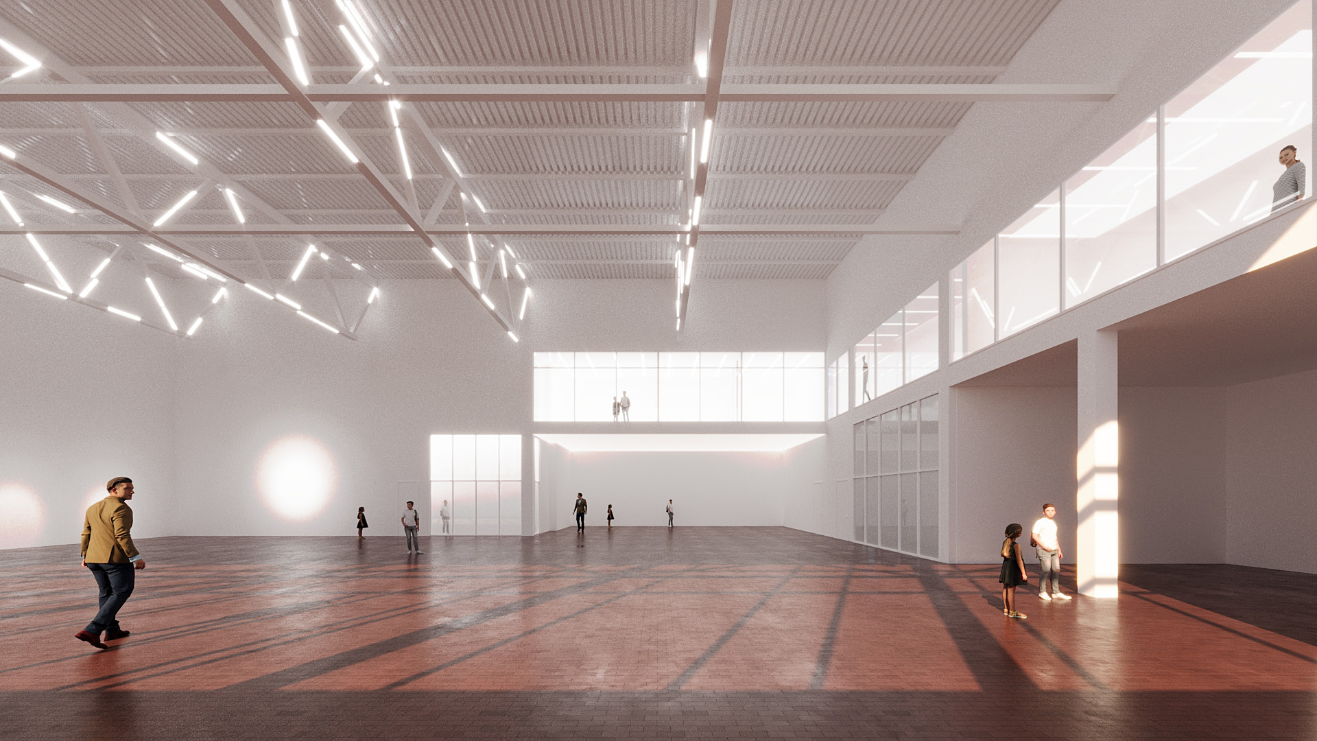 Обзор Белого зала открывается как снизу, с уровня первого этажа, так и со второго этажа — из застеклённого помещения будущего воркшопа.