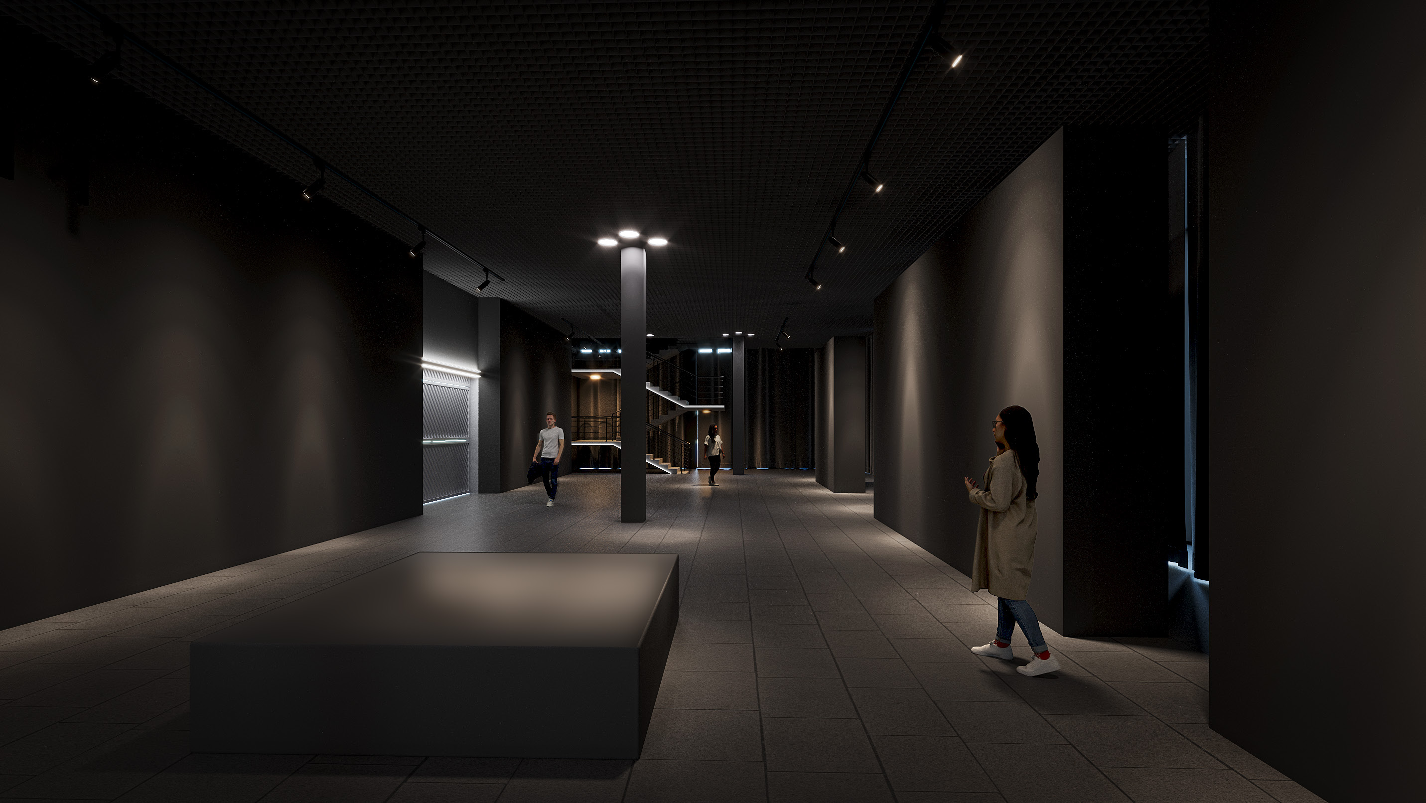 Внутри помещение будет максимально очищено: убраны гипсокартонные короба, в которые сейчас упрятаны металлические колонны и другие конструкции, и навесные потолки-грильято, а также нынешние светильники. Фойе, выполненное для автосалона в светлых тонах, будет более тёмным: стены серые, потолок чёрный. Будет демонтирована специальная вентиляция, необходимая для работы автомастерской и пищеблока, — сейчас она создаёт неприятный звуковой фон, в музее этого звука не будет.