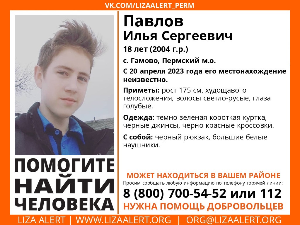 В Пермском крае ведётся розыск 18-летнего Ильи Павлова. Как сообщили в поисковом отряде «Лиза Алерт Пермь», юноша вышел из дома в селе Гамово Пермского МО 20 апреля около 15.00. С тех пор его не видели, на связь молодой человек не выходит.