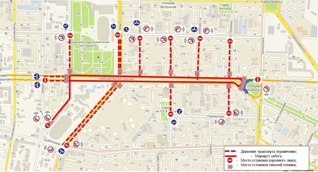 На Комсомольском пр-те от ул. Пушкина до дома №67 и по ул. Краснова от Пушкина до Комсомольского пр-та с 00:00 часов 30 апреля будет запрещена остановка и стоянка любого транспорта до 17:00 1 мая.