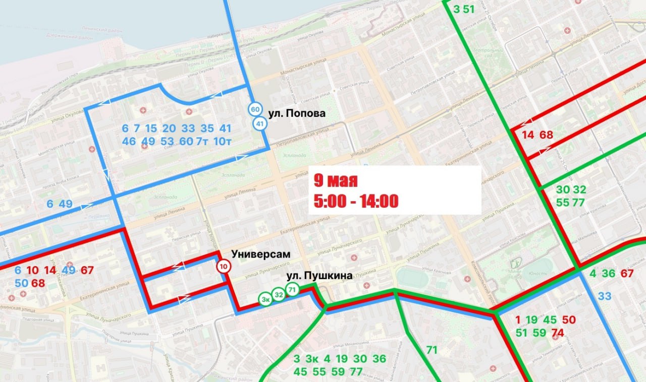 В администрации Перми напоминают горожанам об изменении движения общественного транспорта в День Победы 9 Мая.