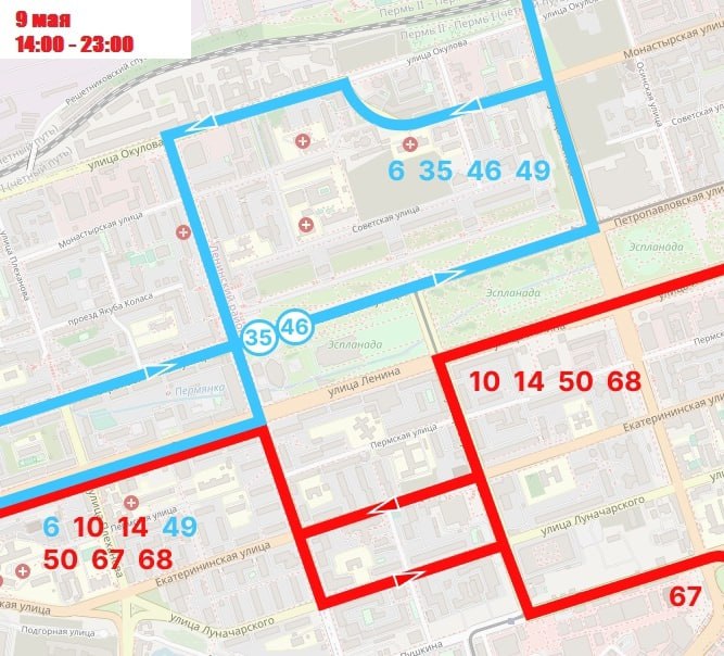 С 14:00 до 23:00 автобусные маршруты № 10, 14, 50 и 68 проследуют по улицам Ленина, Крисанова, Екатерининской/Луначарского, Борчанинова, Ленина. Маршрут № 67 будет следовать по улицам Ленина, Крисанова, Луначарского/Екатерининской, Борчанинова, Пушкина. Автобусы № 6, 46 и 49 проследуют по улицам Попова, Монастырской, Окулова, Крисанова, Петропавловской/Ленина.