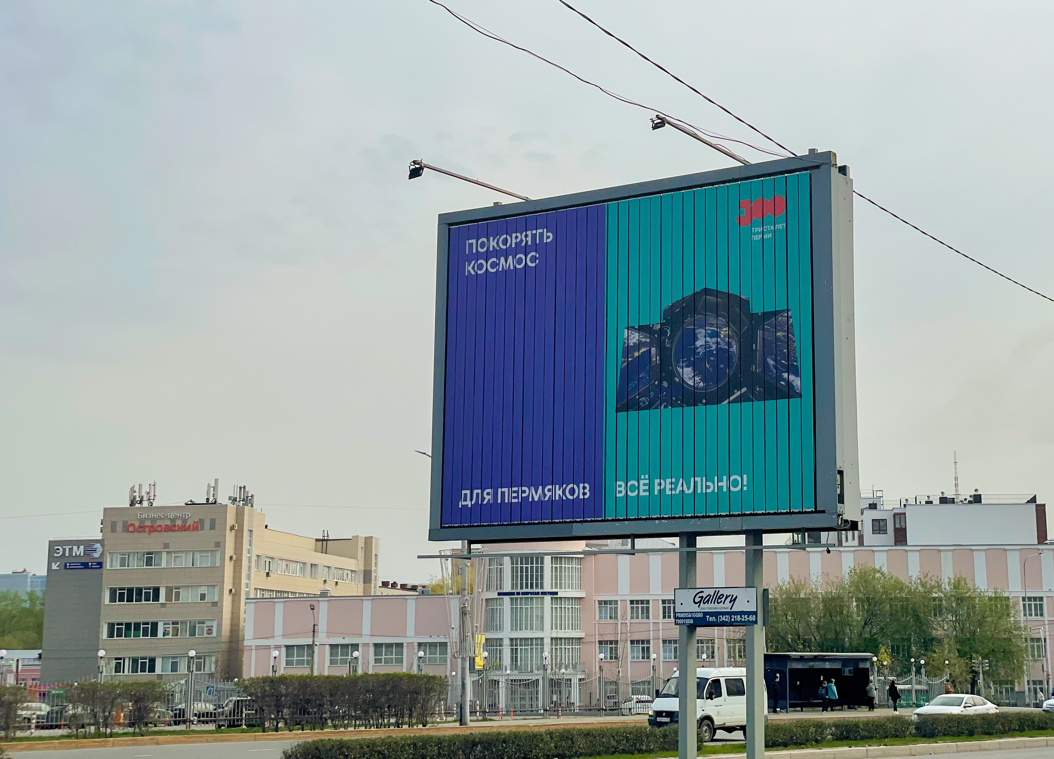 На некоторых билбордах — изображение Земли из космоса. Это отсылка к заводу «Протон-ПМ», который является ведущим предприятием российской космической отрасли.