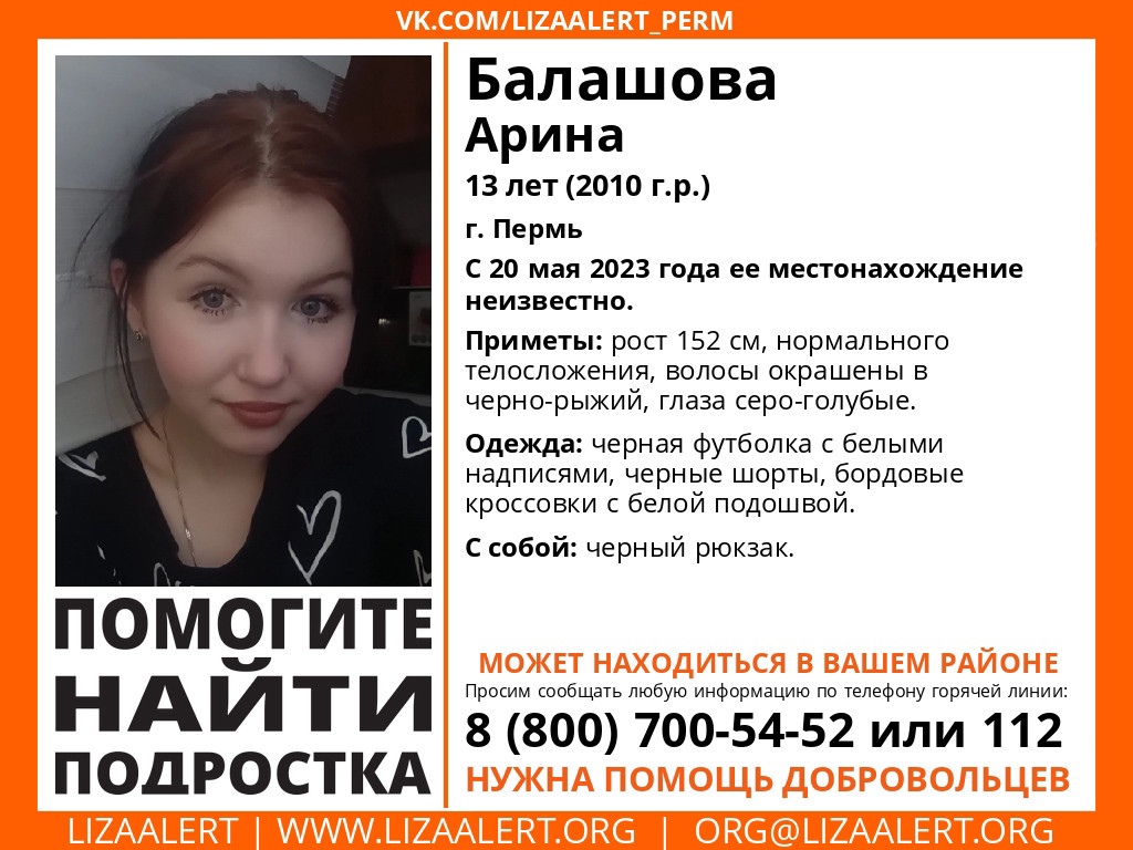 В Перми с 20 мая ищут пропавшую без вести 13-летнюю Арину Балашову. С просьбой помочь в розыске школьницы через соцсети к пермякам обратились активисты поискового отряда «Лиза Алерт».