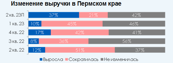 Основные компоненты вывели регион в активную зону роста, оказавшись выше средних показателей. По оценке условий ведения бизнеса 26% опрошенных ожидают их улучшение, 22% предполагают ухудшение ситуации. Компонента «Продажи» по итогам первых трёх месяцев составила 45,2 пункта, что выше общероссийского на 2,5. Её увеличение, отмечают специалисты, произошло за счёт высоких ожиданий, но она остаётся в зоне спада. Так, 37% опрошенных МСБ Прикамья ожидают рост выручки и только 21% — сокращение.