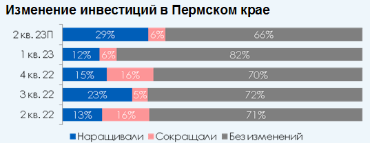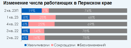 Коэффициент ожидания в изменениях количества работающих в Прикамье оказался немного ниже общероссийских, в связи с чем компонента «Кадры» уменьшилась до 48,8 пункта при заметном росте в России до 51,3. Всего 19% предпринимателей планируют увеличить число сотрудников, что на 11% выше предыдущего периода. При этом планы по сокращению штата также показали положительную динамику — всего 7% опрошенных, тогда как за прошлый квартал уменьшить число сотрудников планировали 25%.