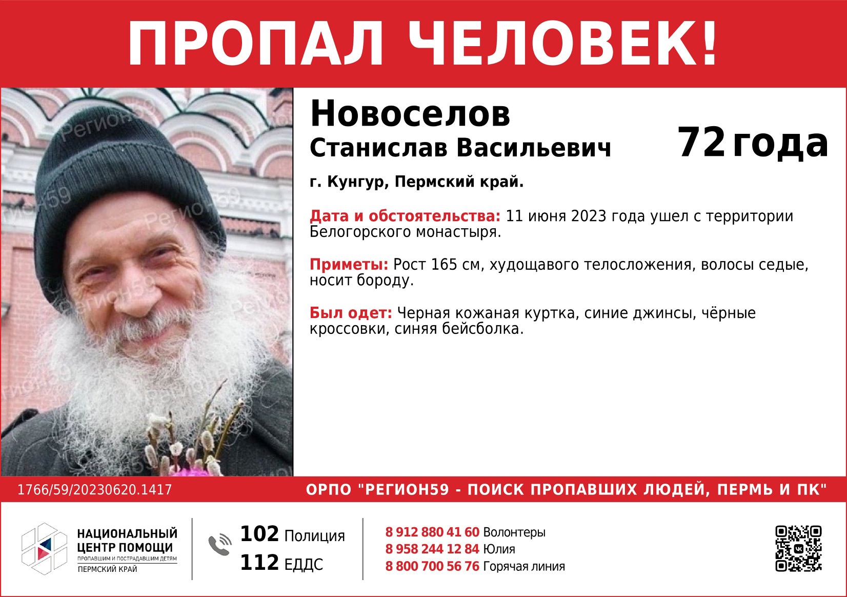 Волонтёры поискового отряда «Регион 59» просят помочь в поисках 72-летнего Станислава Новосёлова. Мужчина 11 июня вышел с территории Белогорского монастыря в Кунгурском округе Пермского края, и с тех пор его местонахождение неизвестно.