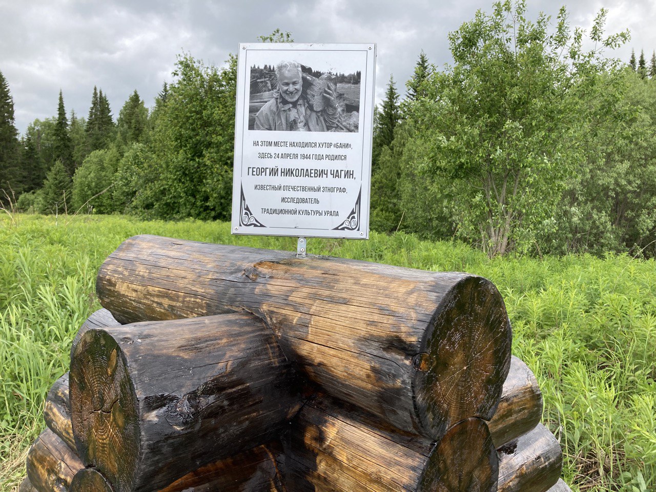 Самого хутора, где 24 апреля 1944 года появился на свет будущий профессор, давно уже нет, но четыре года назад друзья Чагина поставили здесь памятник — угол сруба избы из больших брёвен и табличку с фото, на котором улыбающийся Чагин тащит точно такое же бревно. Фото сделал ближайший друг Чагина, а ныне участник съёмочной группы фотограф Валерий Заровнянных в 2006 году, когда здесь ещё можно было найти остатки оригинальных изб, и Чагин выпилил кусок бревна из сруба родительского дома и увёз в Пермь.