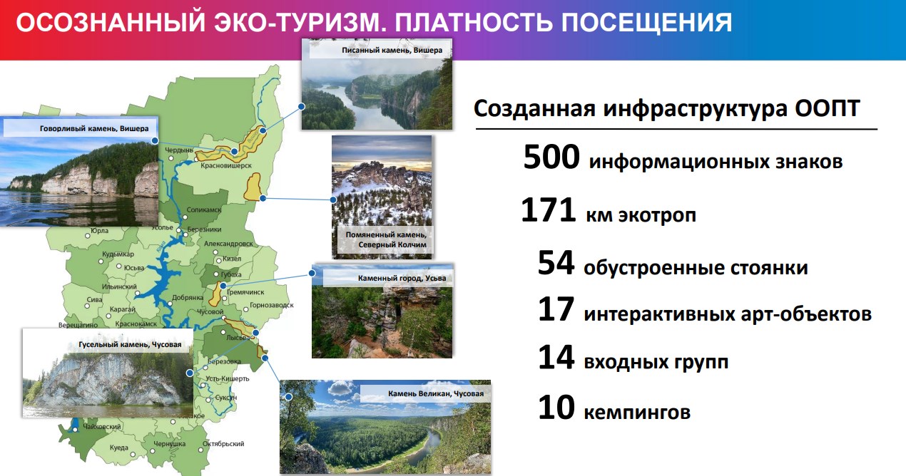 «На сегодняшний день в завершающей стадии находится проектирование комплексного обустройства природного объекта «Каменный город», горы «Ветлан» и Усьвинских столбов. В 2024 году, как и планировали, мы приступим к работам в Каменном городе и на Ветлане. Отремонтируем тропы, установим настилы, лестницы, мостики, ограждения, смотровые площадки, обозначим организованные места отдыха. Также будут обустроены входные группы», — рассказал чиновник.
