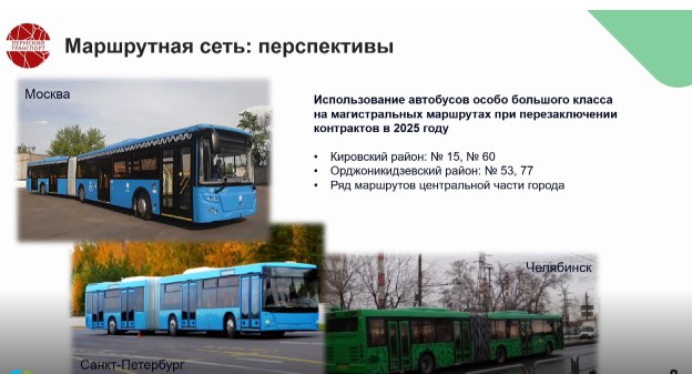 «Нам задавали вопрос, почему мы не используем и не планируем использовать длинные автобусы. Мы проводили круглые столы, многие перевозчики говорили о том, что не хватает водителей, а на длинные автобусы нужен более высокий класс водителей. Будем консультироваться с перевозчиками, и если это будет актуально, мы их запустим, особенно по направлению в Кировский и Орджоникидзевский районы», — рассказал чиновник.