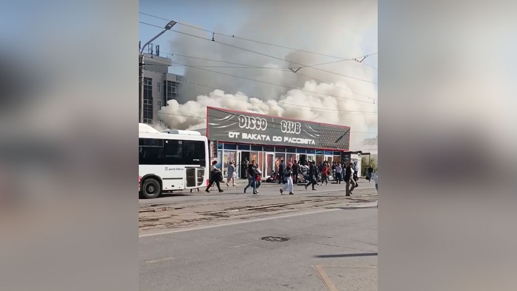 Судя по фото и видео, появившимся в социальных сетях, пожар произошёл в кафе по ул. Пушкина, 89а. По этому адресу также размещается диско-клуб "От заката до рассвета".