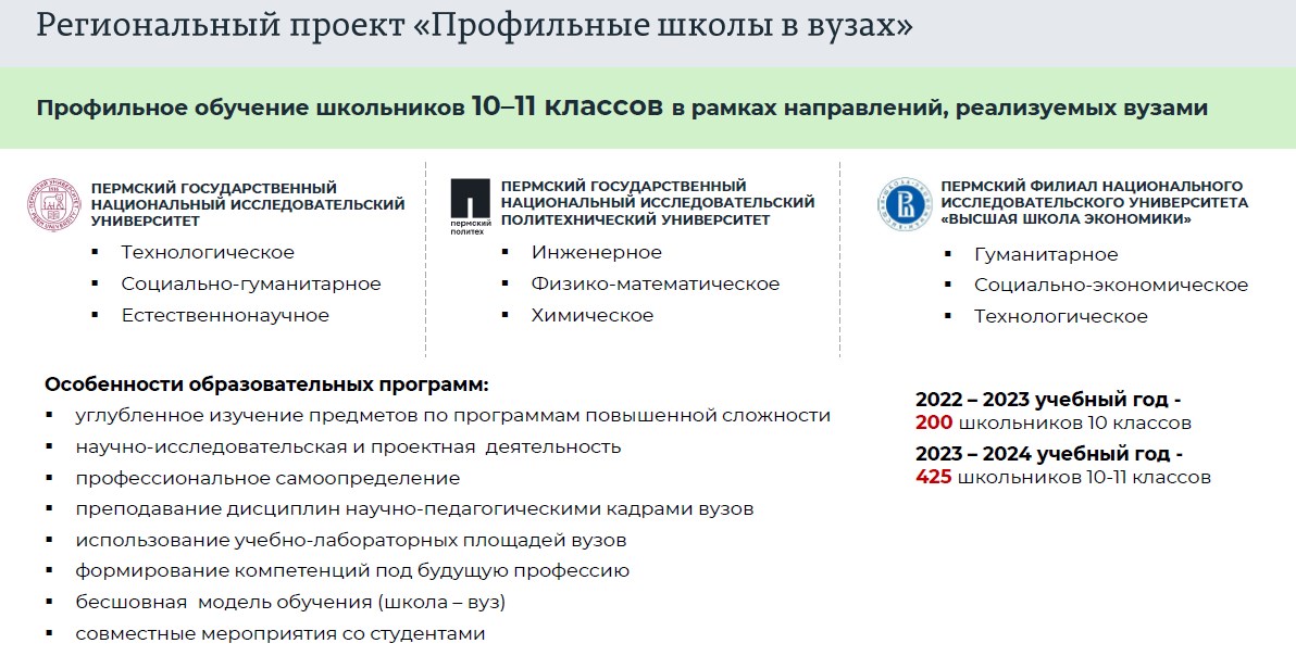 В программе профильных школ — углублённое изучение предметов, научно-исследовательская и проектная деятельность, профессиональное самоопределение, посещение различных предприятий, использование научно-лабораторных площадей вузов и т.д. Лекции школьникам читает профессорско-преподавательский состав пермских университетов.