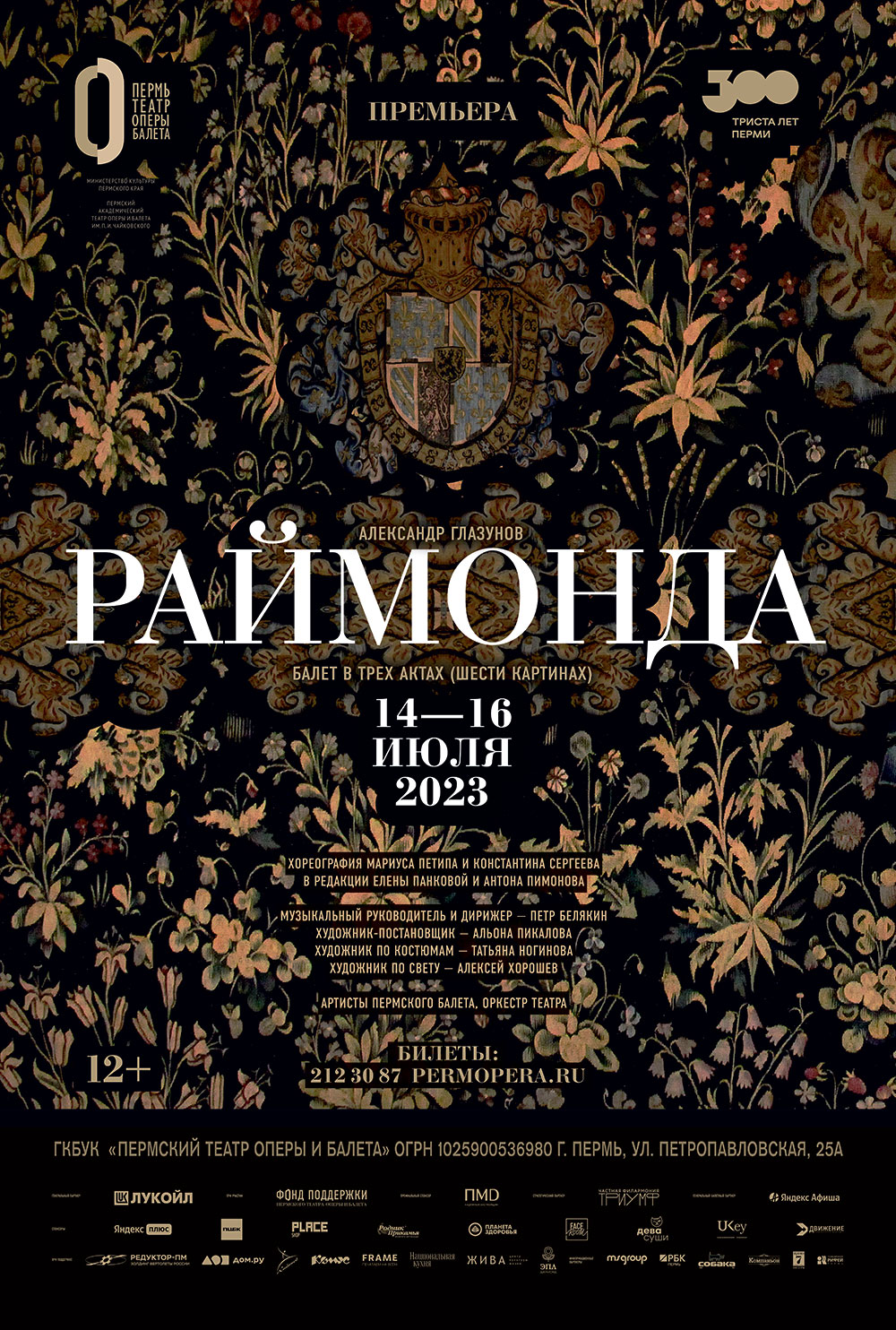 Под занавес сезона 2022/23 Пермский балет выпускает классическую «Раймонду» (12+). Премьера приурочена к 125-летию со дня её первой постановки. Последний шедевр Мариуса Петипа, ставший апогеем эстетики и этого хореографа, и всего классического балета XIX века, и первый балет 33-летнего Александра Глазунова зрители увидят в редакции Елены Панковой и Антона Пимонова. В основе сюжета лежит рыцарская легенда о любви.