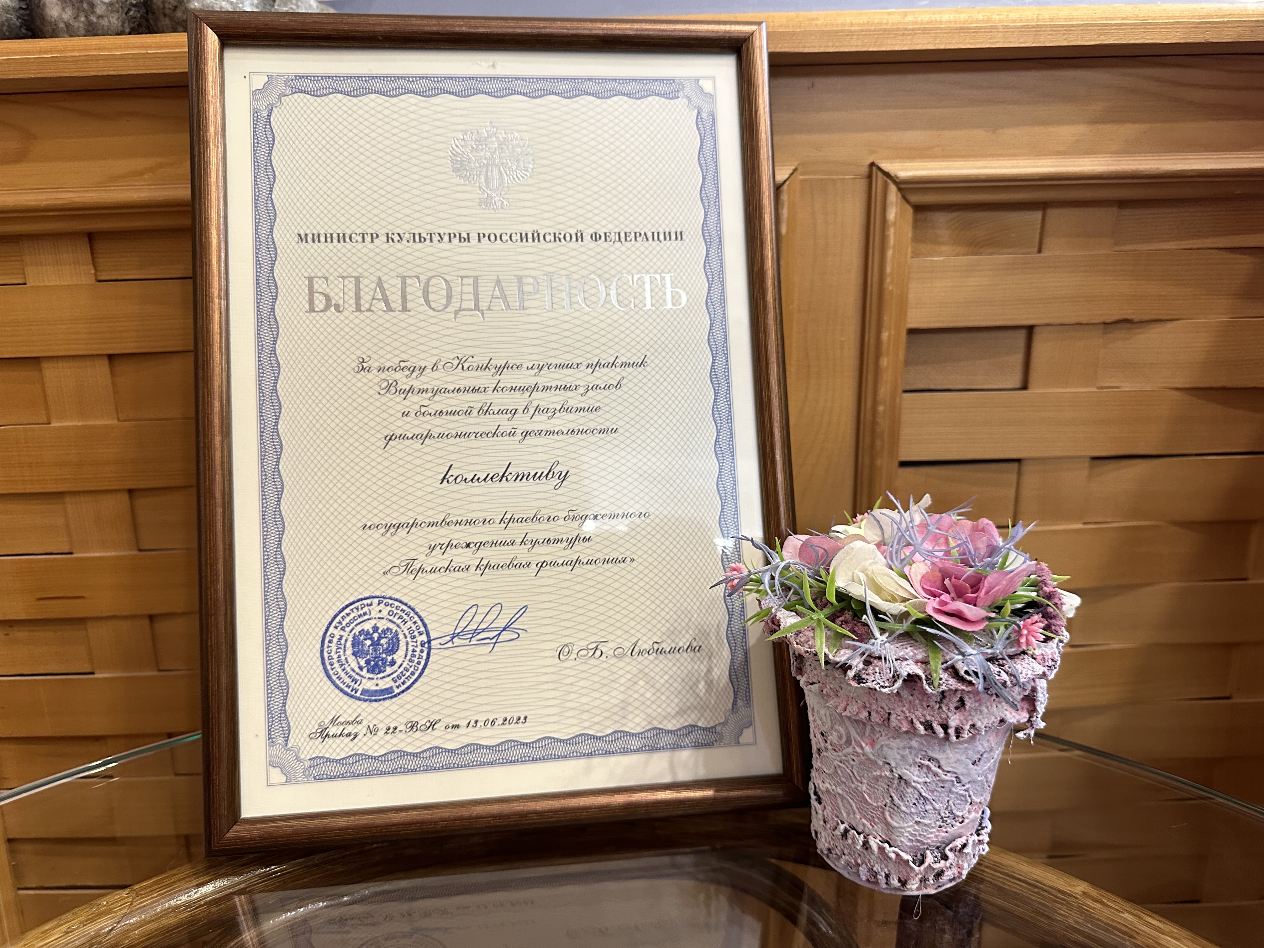 Заместитель Министра культуры РФ Андрей Малышев вручил директору Пермской филармонии Галине Кокоулиной и всему коллективу учреждения благодарность за победу в конкурсе лучших практик Виртуальных концертных залов и большой вклад в развитие филармонической деятельности.