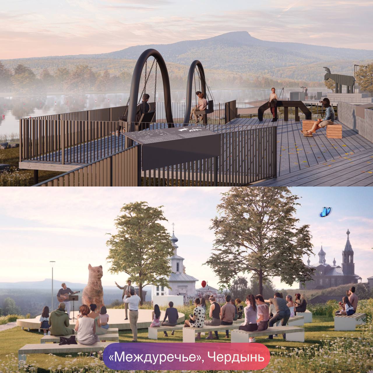 В Чердыни по проекту «Междуречье» преобразится Комсомольский сквер, который граничит с ул. Успенской — центральной в городе и ведущей до Троицкого холма. В сквере появятся пешеходные дорожки, чайный павильон и сцена с видом на Полюд. На самом Троицком холме установят смотровую площадку и тематическую детскую игровую зону.
