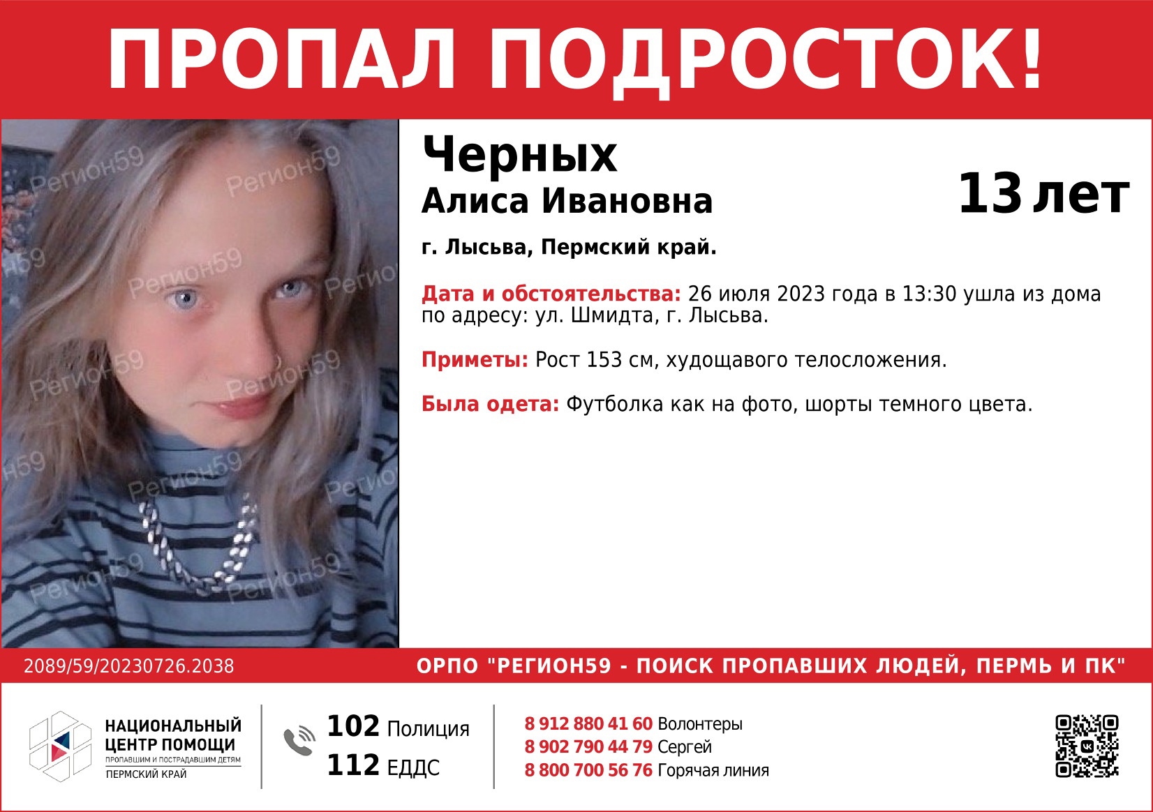 Поисковый отряд «Регион59» просит помочь в установлении местонахождения 13-летней жительницы Лысьвы Алисы Черных. В среду, 26 июля, около 13:30 она ушла из дома по ул. Шмидта и пропала.