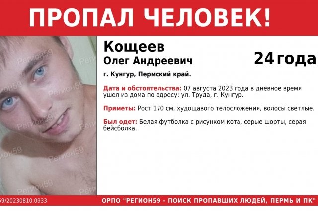 Поисковый отряд «Регион 59» обратился в соцсетях к жителям Пермского края с просьбой оказать помощь в поисках 24-летнего Олега Кощеева. Сообщается, что в понедельник, 7 августа, житель Кунгура ушёл из дома, и с тех пор его местонахождение не известно. Об этом пишет «Рифей».