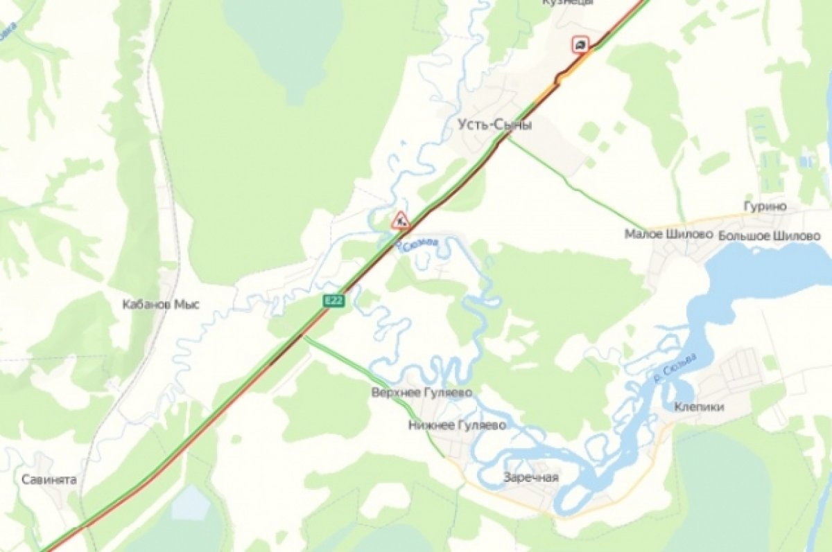 Затор фиксируется на трассе Е22, которая проходит по Краснокамскому округу и переходит в трассу М7 Волга.