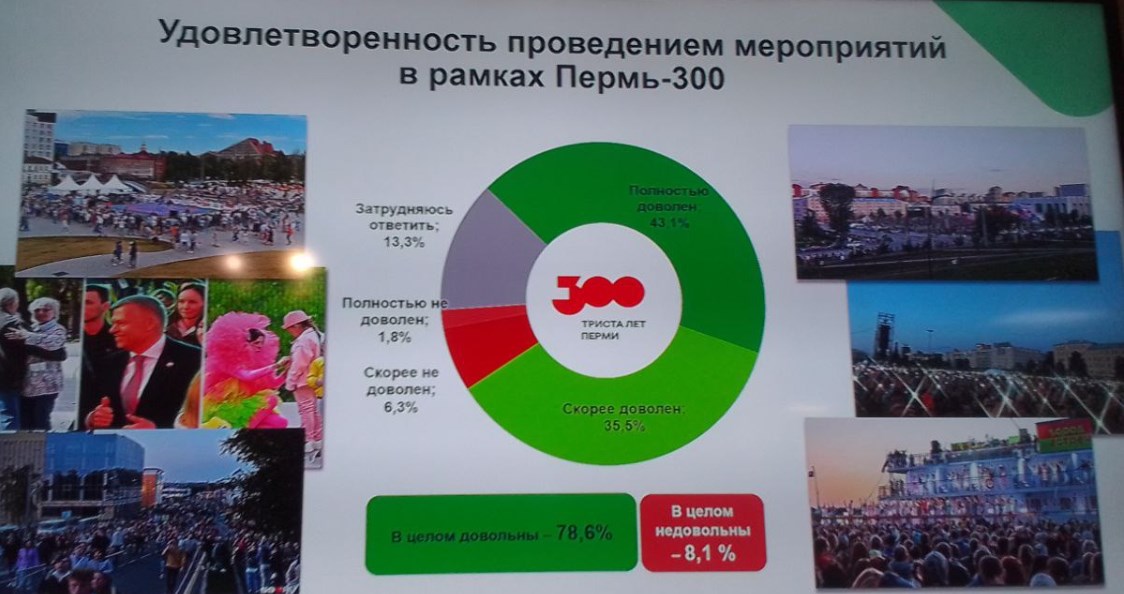 В целом довольными проведением мероприятий в рамках 300-летнего юбилея Перми оказались 78,6% респондентов, а недовольными — 8,1%.