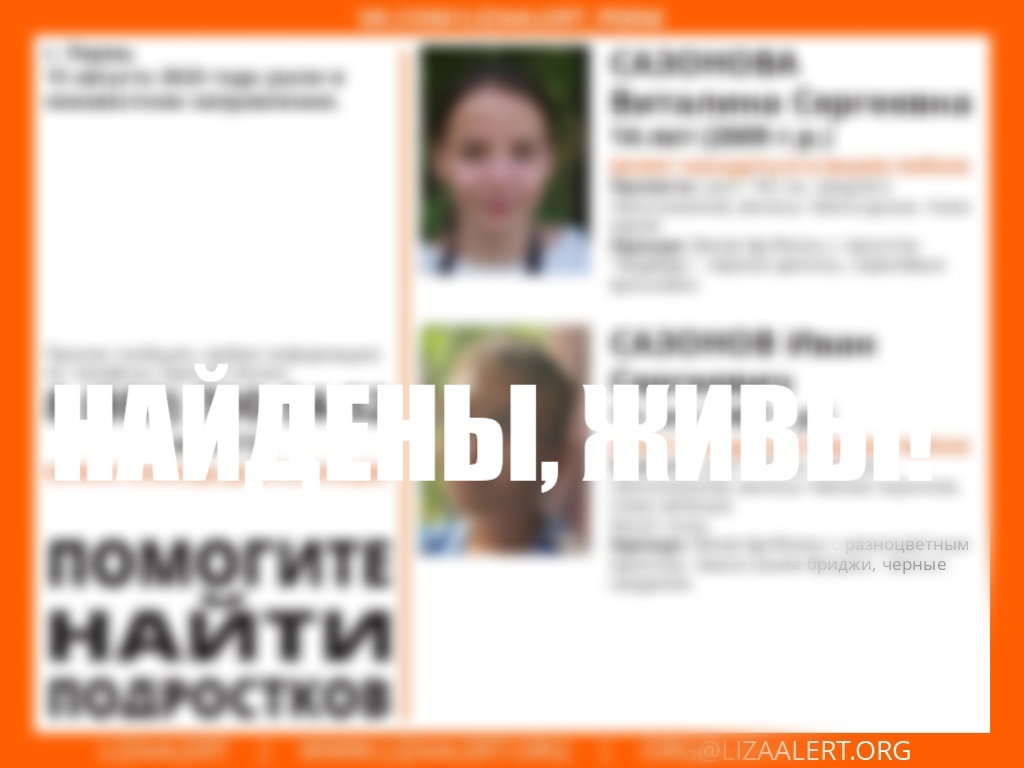 В Перми нашлись пропавшие 13 августа Виталина и Иван Сазоновы. Об этом сообщили в поисковом отряде «Лиза Алерт». Оба подростка в порядке.