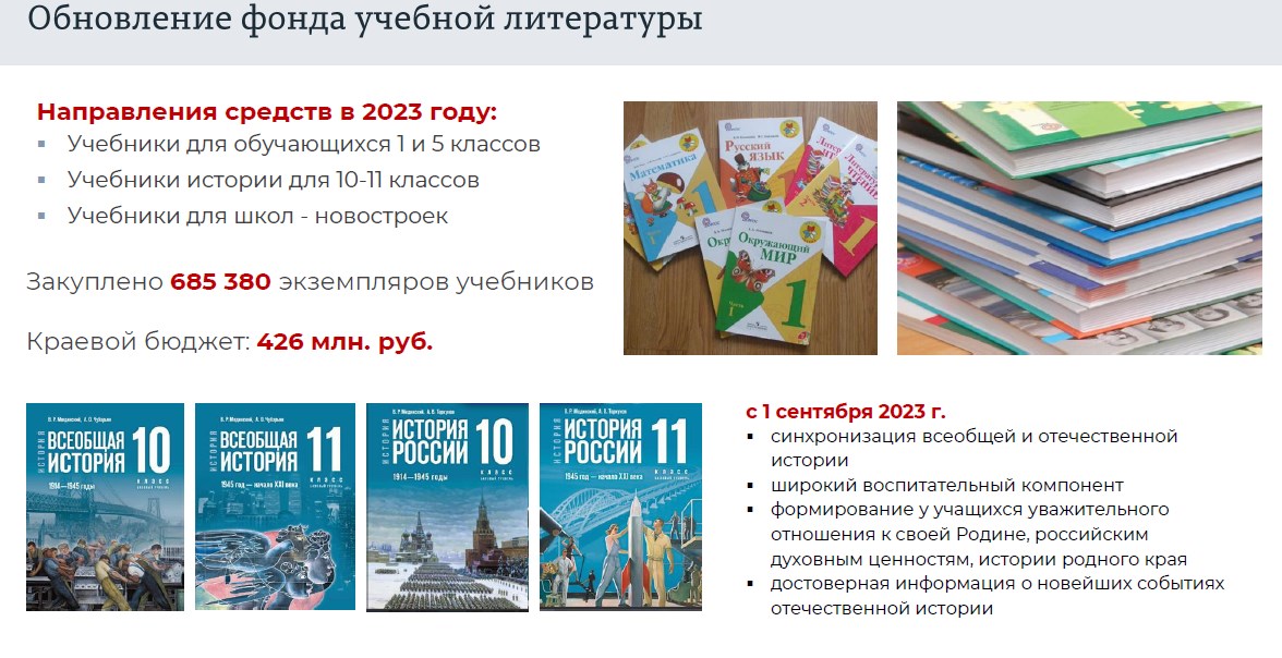 «Приобрели учебники истории для 10-11 классов. Они совсем новые и направлены на то, чтобы синхронизировать те процессы, которые проходят сейчас в обществе, с процессами, которые были ранее. Уже абсолютно современная текущая ситуация разъяснена, и так далее. На эти цели мы направили дополнительные средства, и учебники будут поставлены в течение сентября», — отметила чиновница.
