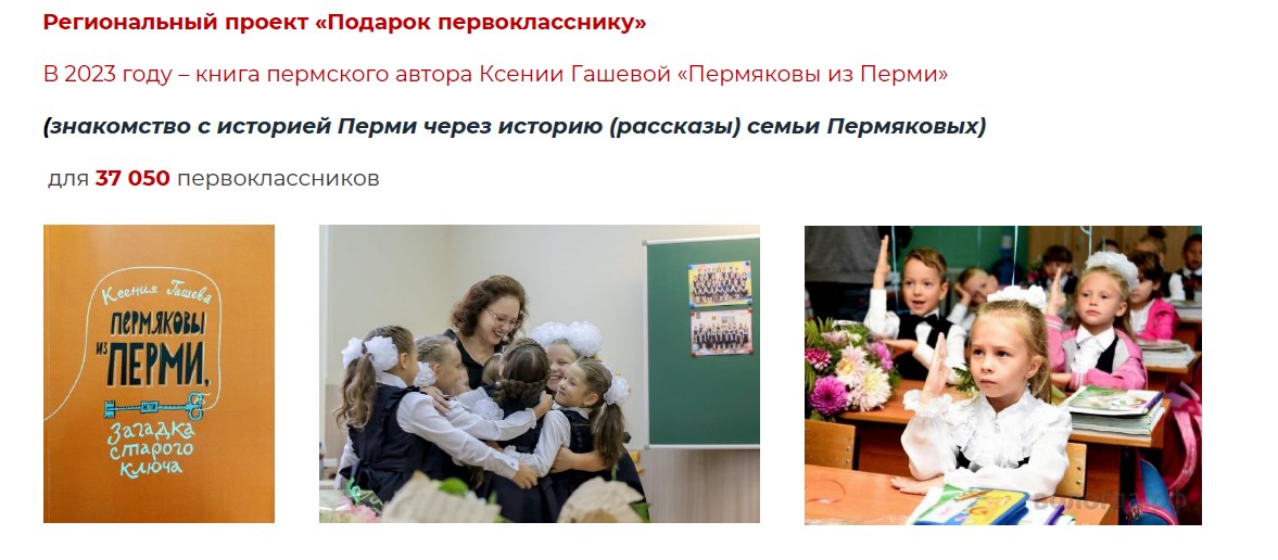 «Мы готовим всем первоклассникам губернаторский подарок. В 2023 году это книга пермского автора Ксении Гашевой, которая называется «Пермяковы из Перми». Издание посвящено, прежде всего, 300-летию Перми и рассказывает, как живут и чем занимаются ребята, проживающие в Пермском крае», — пояснила чиновница.