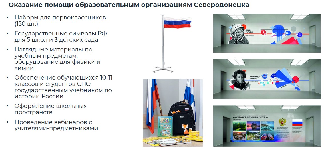 «Мы активно поддерживаем новый регион РФ, Луганскую народную республику. Стараемся отправить всё, что необходимо к 1 сентября. Уже направили 150 наборов для первоклассников. Приобрели наборы для первоклассников, поставили государственные символы РФ для пяти школ и трёх детских садов, направили наглядные материалы по учебным предметам, оборудование для физики и химии, обеспечили всех государственной символикой и учебниками», — рассказала Кассина.