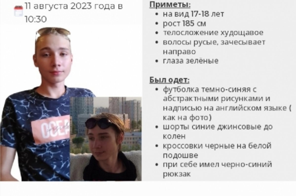 Напомним, Сергею на вид 17-18 лет, рост 185 см, худощавого телосложения, русые волосы, зелёные глаза, был одет в футболку тёмно-синего цвета, синие джинсовые шорты, чёрные на белой подошве кроссовки. При себе у него был чёрно-синий рюкзак.