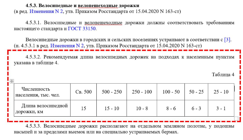 «Пунктом 4.5.3.2 предусматривается организация велосипедной инфраструктуры на подъездах к населённым пунктам. Длина велосипедной дорожки зависит от числа жителей ближайшего населённого пункта. К сожалению, данный раздел носит лишь рекомендательный характер», — отметил Александр Синявский.